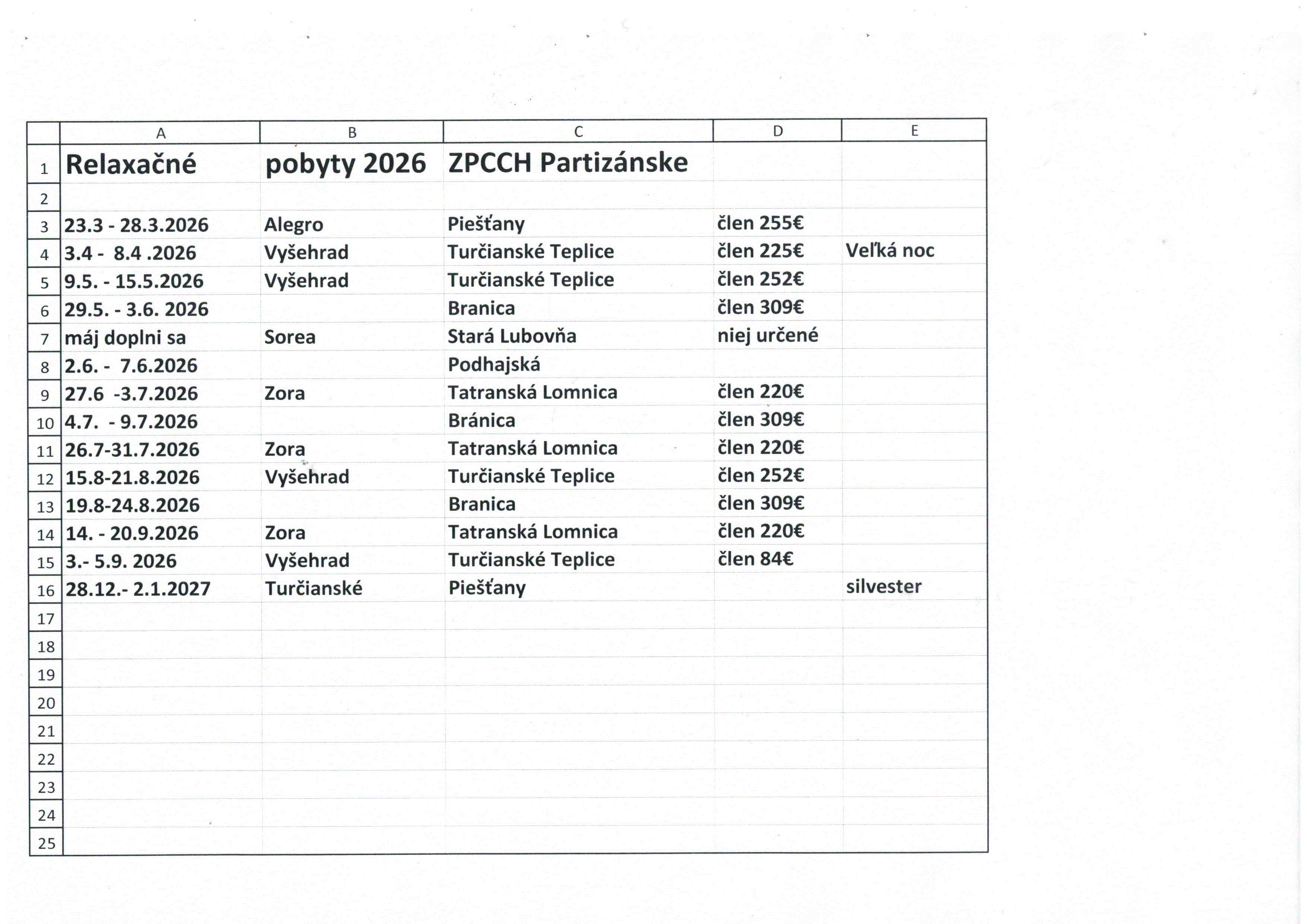 14.-19.7.2024 6 dňový pobyt Zora Vysoké Tatry 10.7. 2024 od 13,00 hod. Lubianka spol. popoludnie 24.7.2024 od 7,00 hod. jednodňový Vadaš relax. kúpanie 28.7. 2.8.2024 Piešťany Alegro 27.7.2024 Anabál Trenčín |
